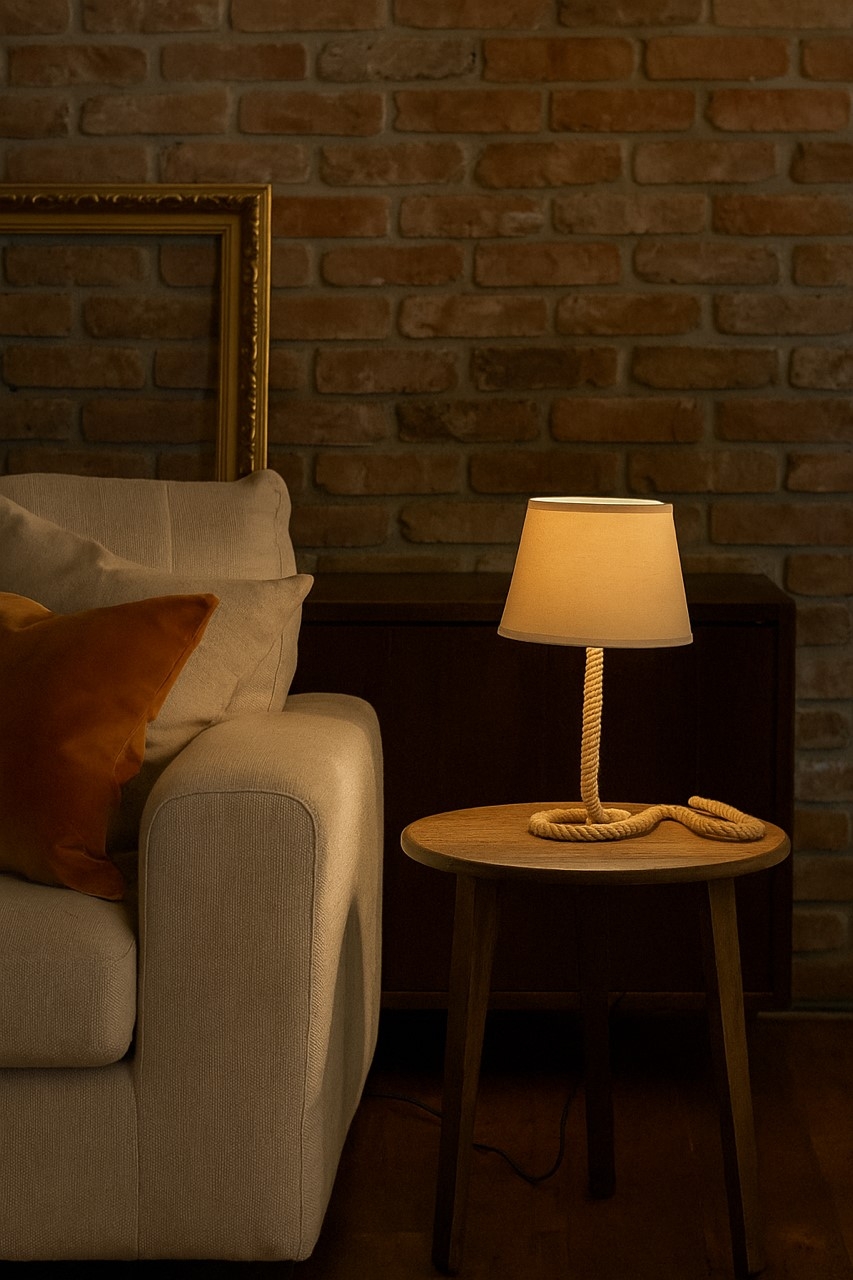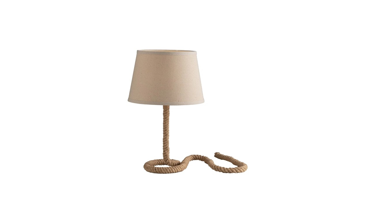 La lampe de table ROPE présente une structure métallique entièrement recouverte de corde de chanvre naturel. Abat-jour tronconique en tissu couleur sable.