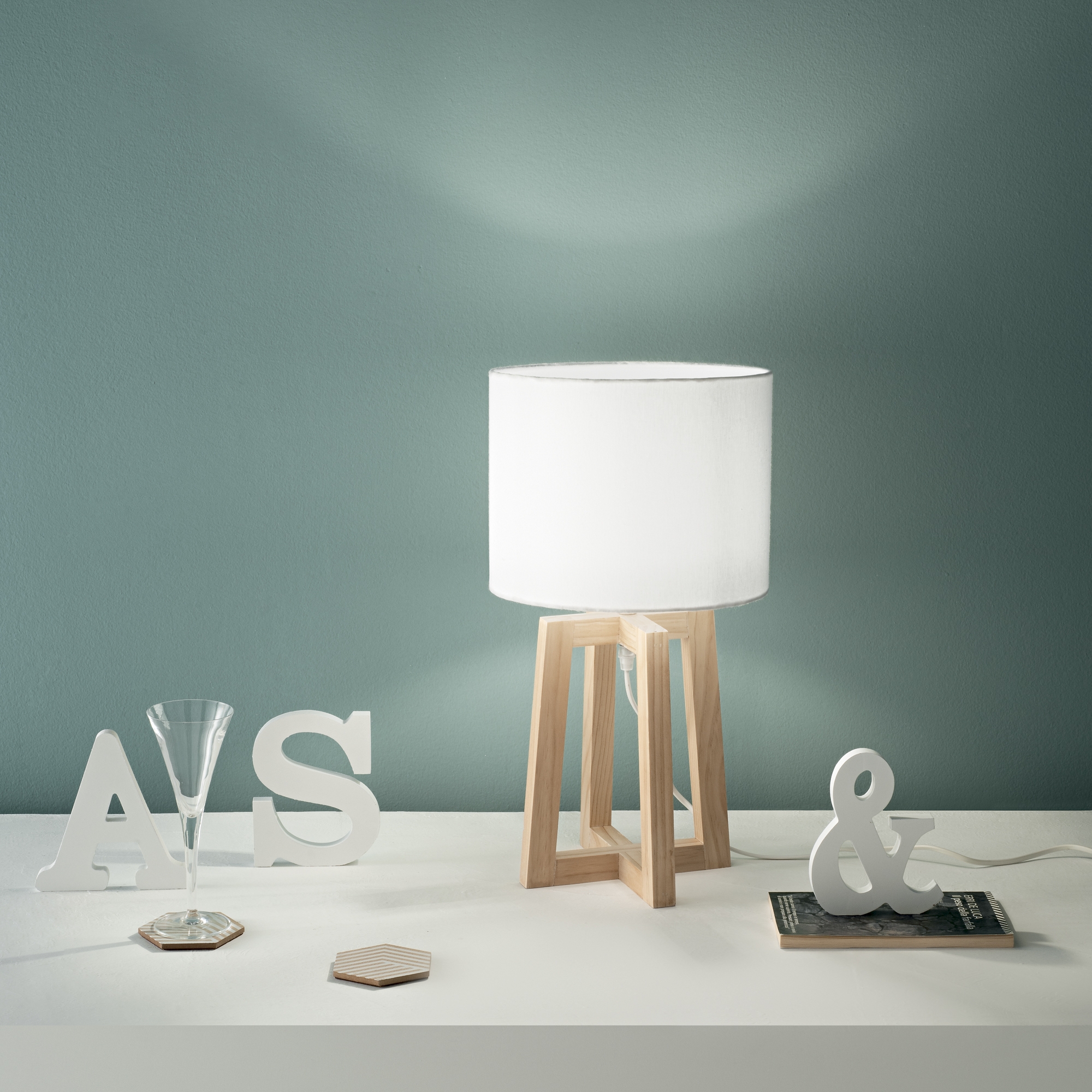 Son pied en bois clair aux lignes géométriques apporte une touche scandinave tendance, tandis que son abat-jour en tissu blanc diffuse une lumière douce et apaisante, parfaite pour créer une ambiance cosy dans une chambre, un salon ou un bureau.