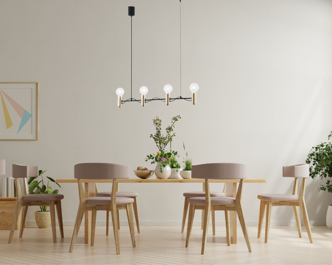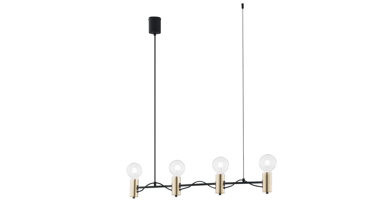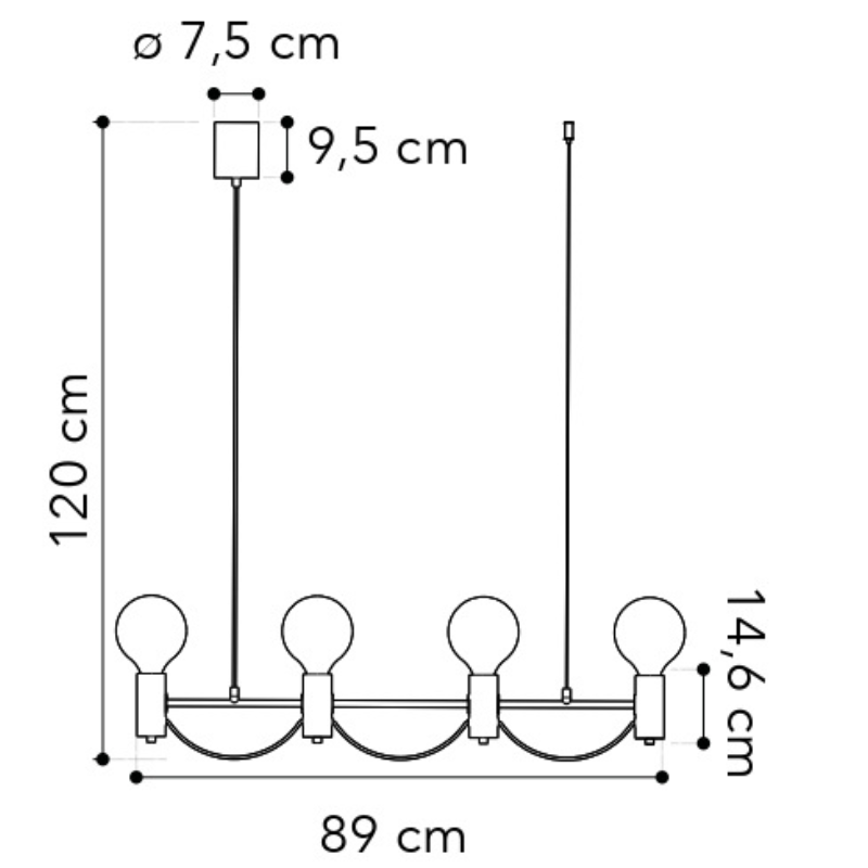Une solution moderne au design minimal et élégant pour donner une touche de lumière à vos pièces, que ce soit la cuisine, le salon ou votre chambre. Une touche particulière est représentée par le support de lampe recouvert de métal doré qui se démarque et apporte de la brillance à la structure noire. De plus, la douceur du câble en tissu parvient à apporter de l'harmonie à l'ensemble de la structure, diffusant cette sensation à tous les meubles de la pièce. Idéal pour ceux qui veulent quelque chose d'unique et différent des modèles commerciaux habituels, pour éclairer et meubler en même temps. Capable d'apporter une sensation de paix et de détente grâce à l'équilibre parfait avec lequel cette lampe reste suspendue. Il monte jusqu'à quatre ampoules avec douille E27, maximum 60W.